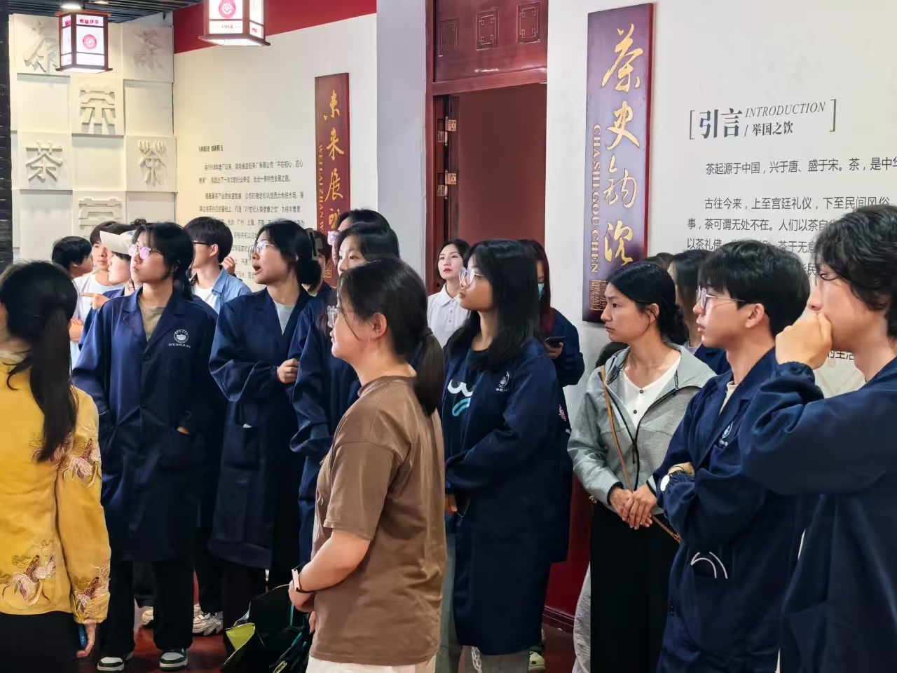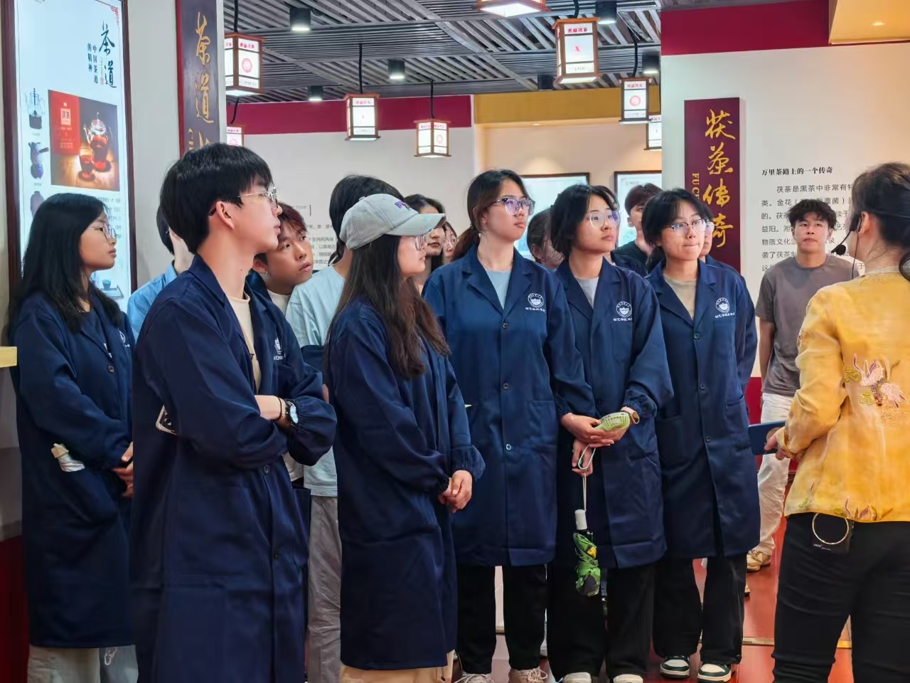 師生們首先實地參觀了湘益生產(chǎn)線與茶博館。在生產(chǎn)車間,同學(xué)們親身感受益陽茶廠標準化、現(xiàn)代化的生產(chǎn)流程,對茯磚茶的制作工藝有了初步直觀的了解。茶博館內(nèi)陳列的一件件展品,則如同一部生動的茶文化史書,讓師生們沉浸式領(lǐng)略益陽茶廠深厚的文化底蘊,探尋茯茶的前世今生,深刻體會 “一片茶葉承載的使命”。