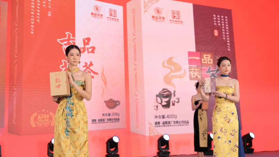 在發布儀式上,與會領導和專家共同啟動推桿,隨著金沙傾瀉而下,"紀廿"新品正式亮相,象征著湘益茯茶開啟新的發展征程。隨后,一場別開生面的新品模特走秀吸引全場目光。身著典雅服飾的模特手捧"紀廿"新品,以優雅的姿態展示這款傳承與創新相結合的茯茶珍品,傳統茶文化與現代時尚在此完美交融,凸顯出新品的獨特魅力。